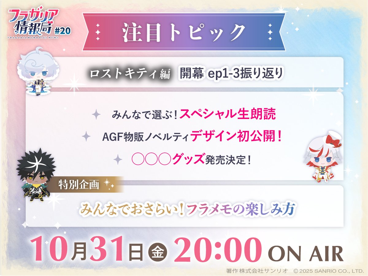 / #フラガリア情報局 #20 ロストキティ編公開記念 & みんなでおさらい!フラメモの楽しみ方SP🎉 \ 🔔明日20:00〜ON AIR!! ロストキティ編の感想をキャストと共有しよう♪ 番組限定シナリオの生朗読や、最新グッズ情報も!🍓 🔗https://t.co/iSCFBzILbH #フラガリアメモリーズ