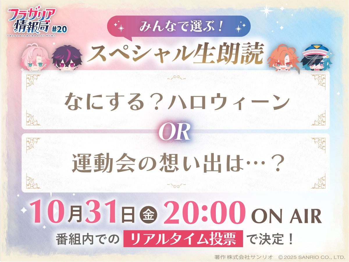 / #フラガリア情報局 #20 ロストキティ編公開記念 & みんなでおさらい!フラメモの楽しみ方SP🍓🎉 \ 本日20:00〜ON AIR!!🔔 🔗https://t.co/iSCFBzILbH 番組内のリアルタイム投票でシチュエーションを決める「みんなで選ぶ!スペシャル生朗読」の選択肢を先行公開📖🎙️ #フラガリアメモリーズ