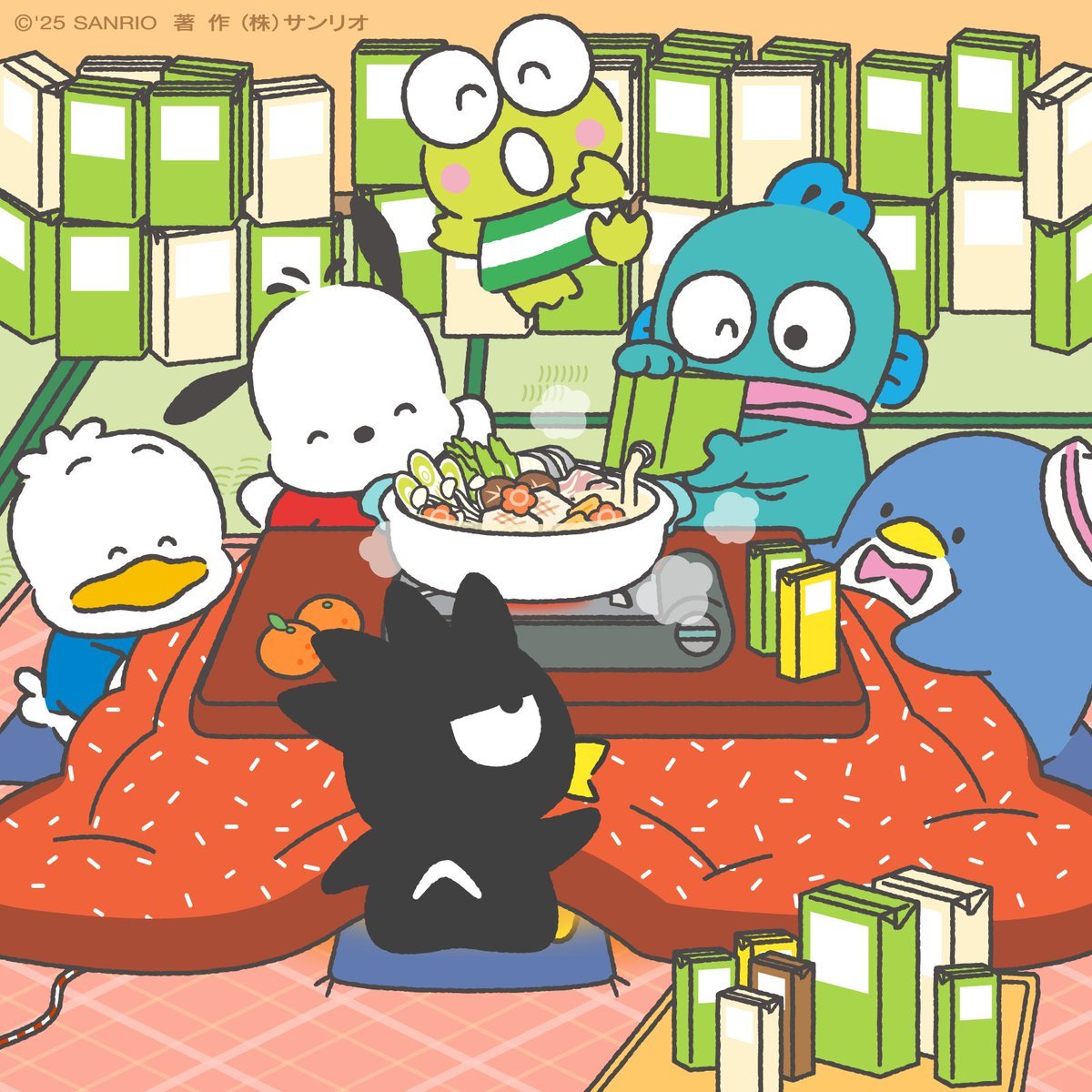 けろっぴ「今日はおこたで鍋パー!」 ハンギョドン「豆乳を投入〜!」