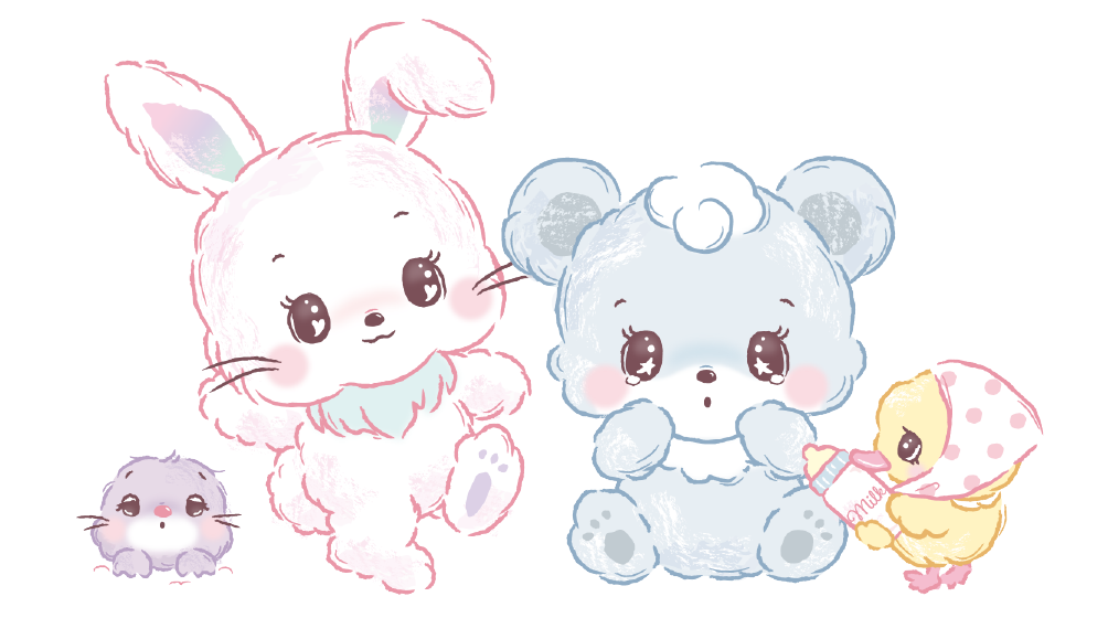 【NEXT KAWAII PROJECT 最終STEP進出キャラクター】 あひるのかあさんの子育て奮闘記 ちょうちょさんは、森で泣いている赤ちゃんを見つけてあひるのかあさんに知らせにいきました。 いつも元気なうさぎのホップルー。ちょっぴり泣き虫なクマのウルルー。マイペースなもぐらのモグルー。 子育ては大変だけど、かわいくてしょうがない!この日からお世話のはじまりです。