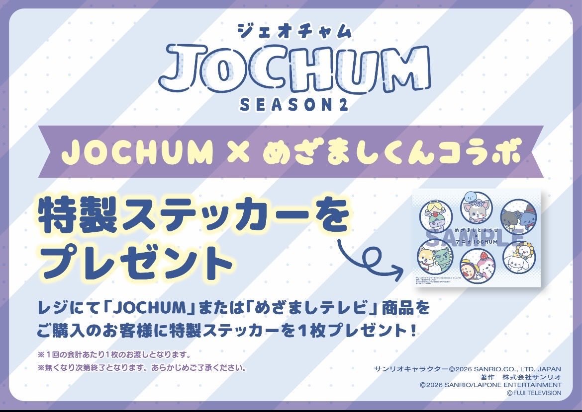 【お知らせ📢】 #JOCHUM と #めざましくん のコラボイラストを使用した特製ステッカーの配布キャンペーンが決定! 3月5日(木)より店頭でJOCHUMまたは #めざましテレビ 商品をご購入のお客様にプレゼント✨ ※注意事項は画像をご確認ください。