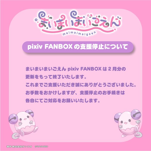 まいまいまいごえん pixiv FANBOXは2月分の更新をもって終了いたします。 これまでご支援いただき誠にありがとうございました。 お手数をおかけしますが、支援停止のお手続きは各自にてご対応をお願いいたします。 ▼詳細はこちら https://t.co/ynpsUibSkE…
