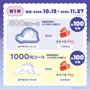 「おやすみクッション」または「えらべるPay 1,000pt」 - 対象商品を税込み1,000円以上ご購入
