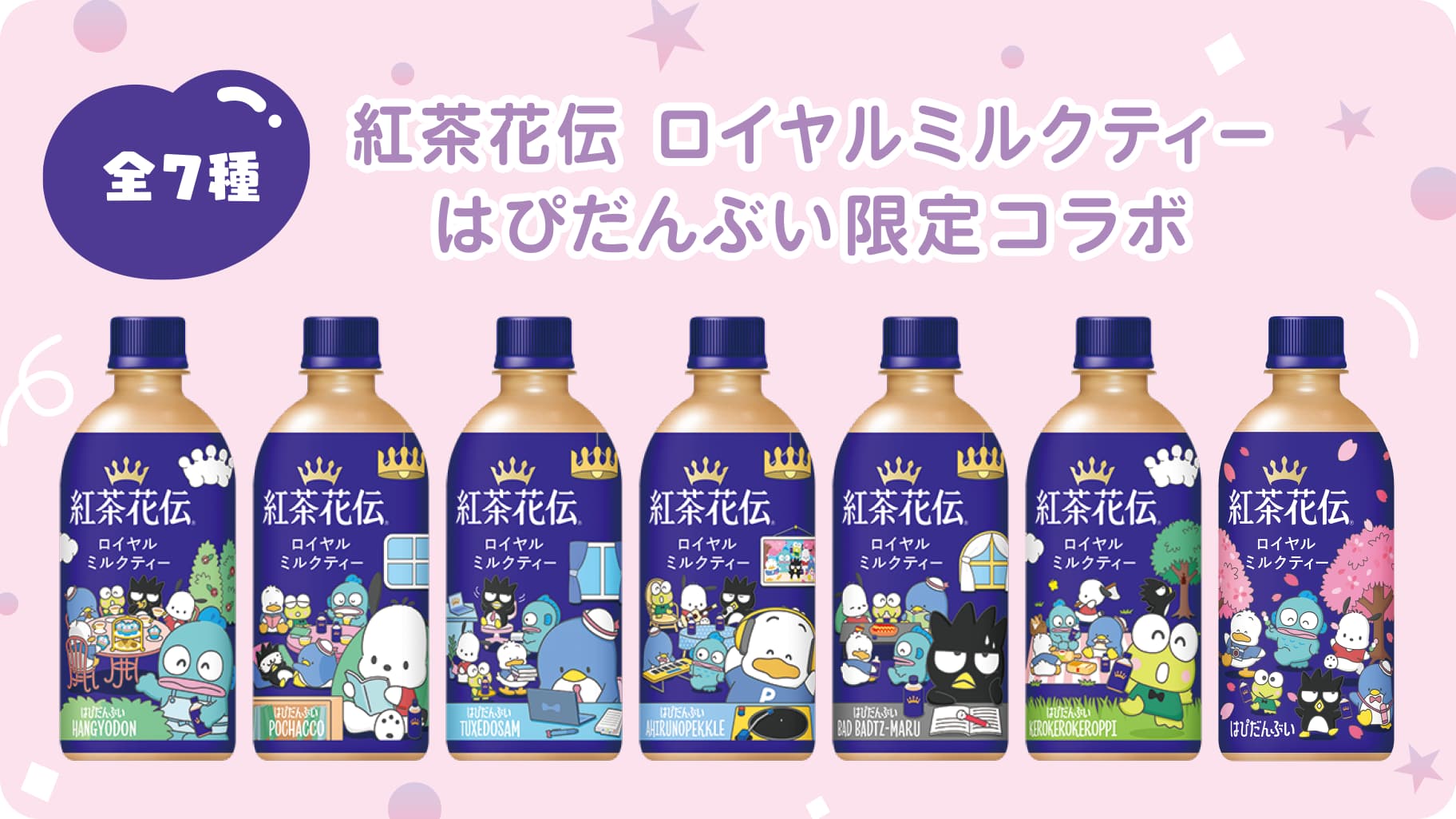 「無糖アールグレイアイスティー×クロミ」「ロイヤルミルクティー×はぴだんぶい」は各7種のデザインをラインナップ。