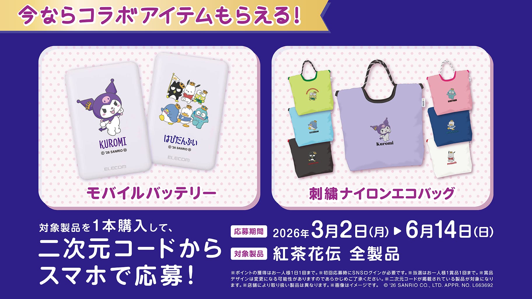 ポイント数に応じて、抽選で「はぴだんぶい」「クロミ」のオリジナルコラボアイテムなどが当たるチャンス♪