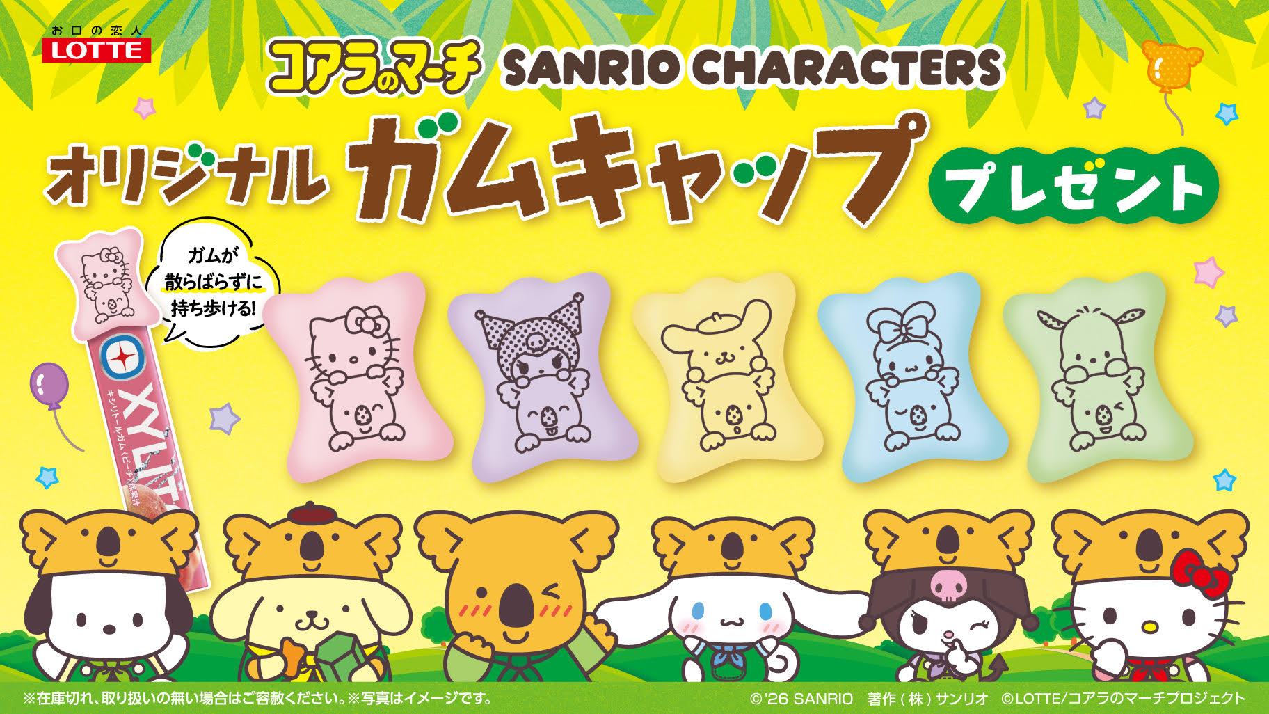 対象のロッテ「キシリトールガム」「アクオ」購入で「コアラのマーチ×サンリオキャラクターズ」デザインのオリジナルガムキャップを1つもらえるキャンペーンが実施されるよ☆