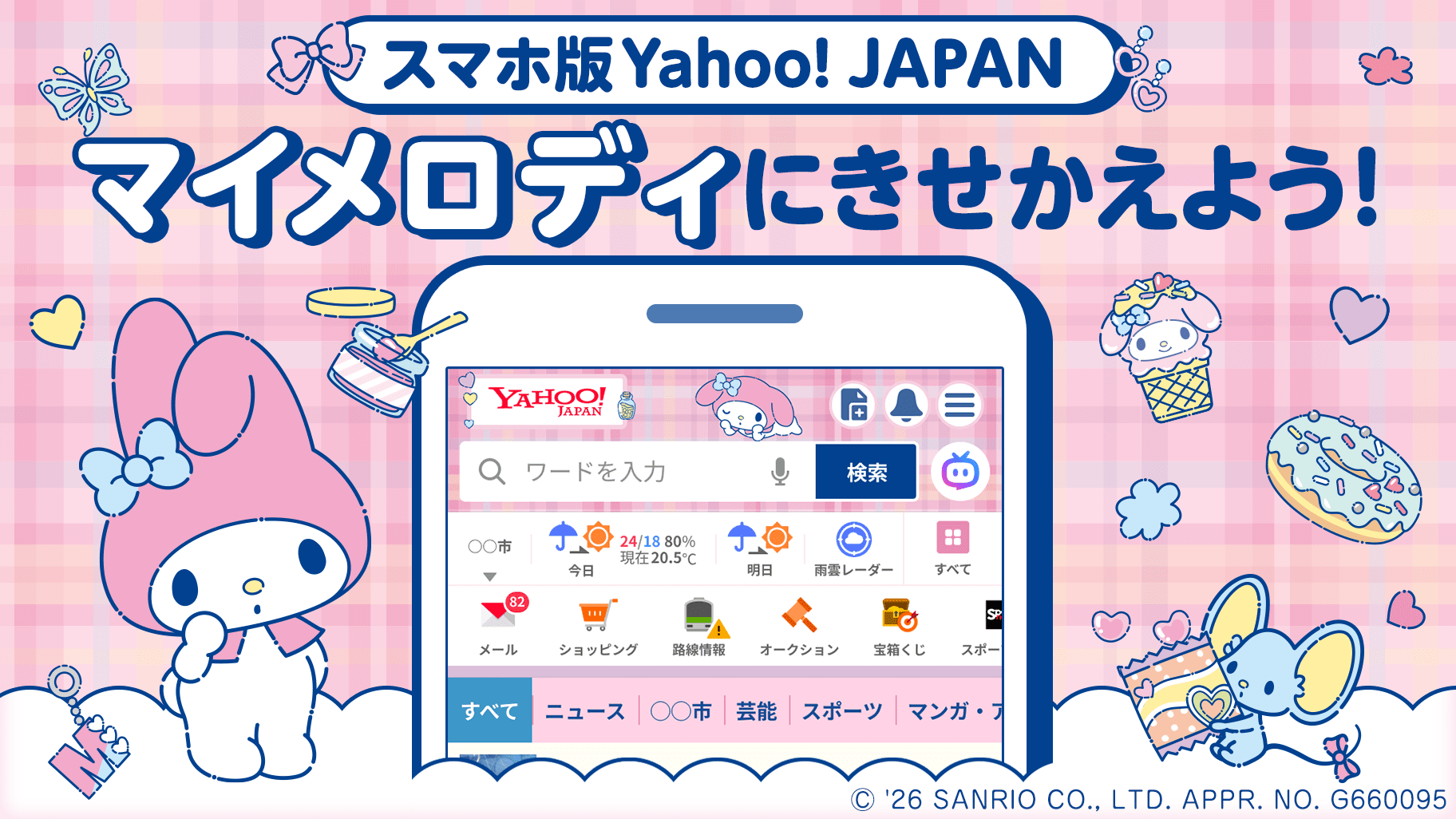 スマホ版Yahoo! JAPANのきせかえテーマに、マイメロディの新デザインが登場♪ トップぺージや検索結果を無料できせかえできちゃうよ☆ やさしいピンクのチェック柄がかわいいね♡ ぜひチェックしてみてね!