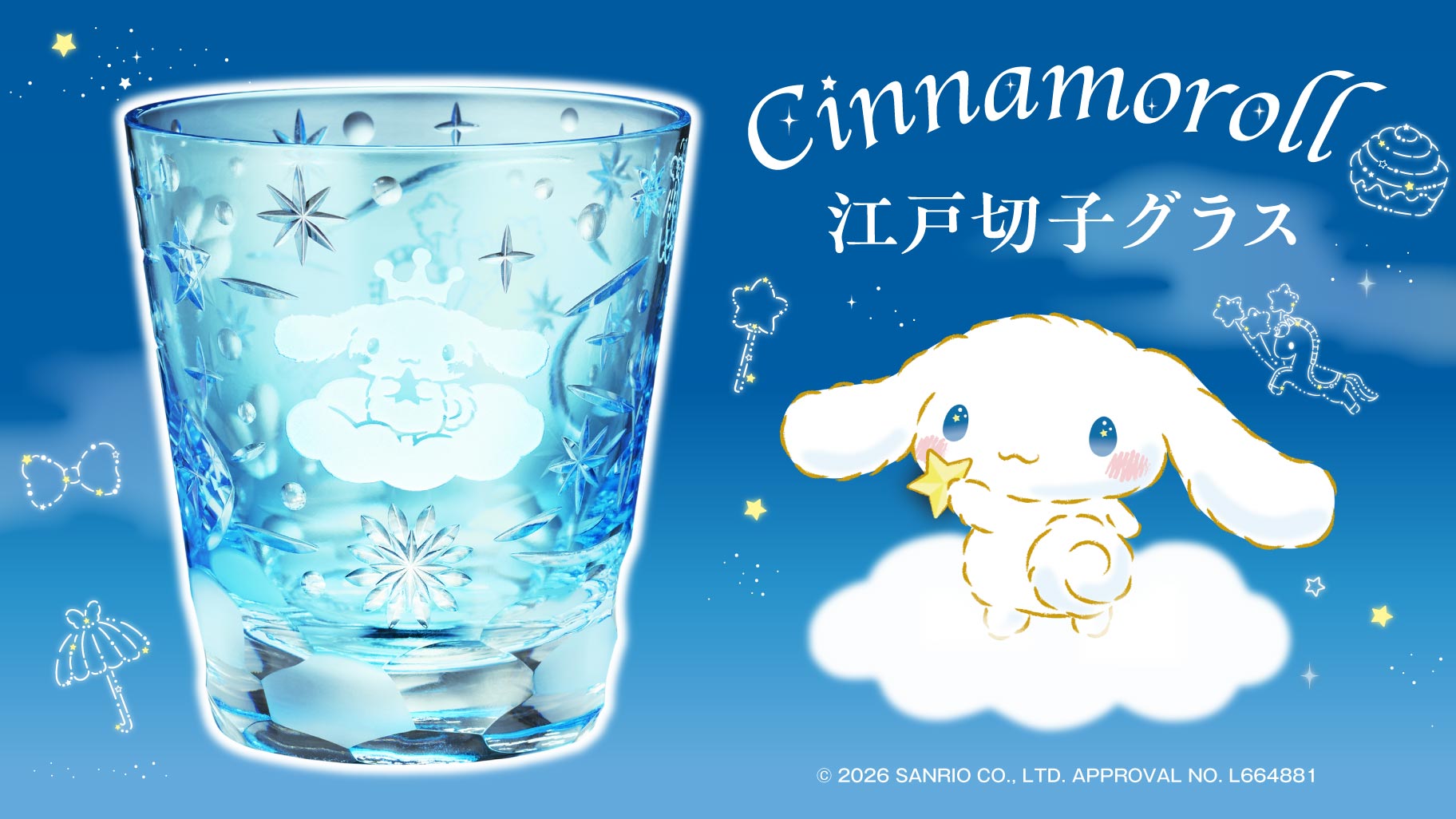 日本の伝統工芸「江戸切子」とシナモロールが初コラボ♡ 夢いっぱいの星空に願いを込めた、江戸切子グラスが登場したよ! 王冠を被ったシナモンの特別デザインがかわいいね♪ PREMICOオンラインショップで発売中! 特製桐箱に収めてお届けするよ☆ 数量限定なので早めにチェックしてね♪