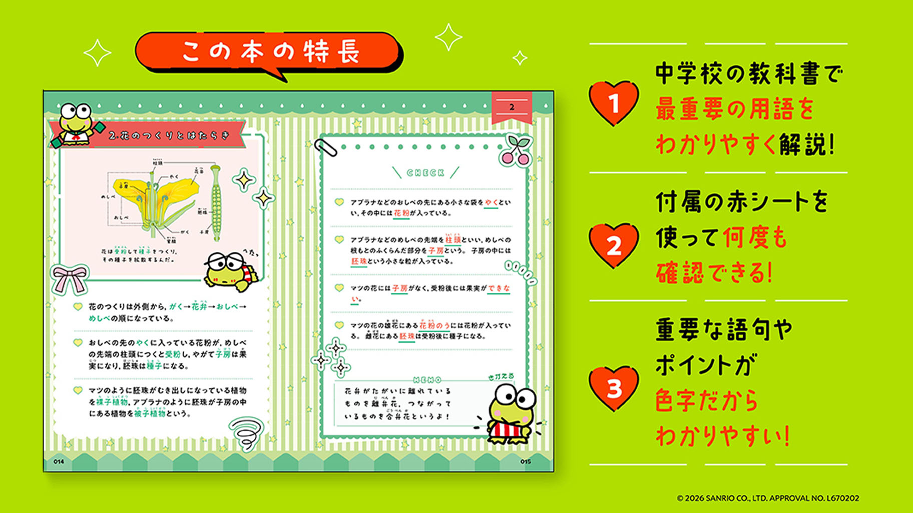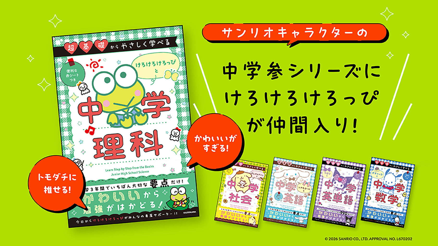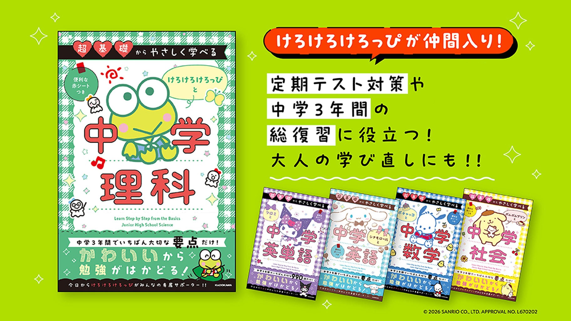 「やさしめ&要点整理」のサンリオキャラクターの中学参シリーズから『超基礎からやさしく学べる けろけろけろっぴと中学理科』が登場したよ!