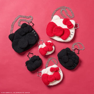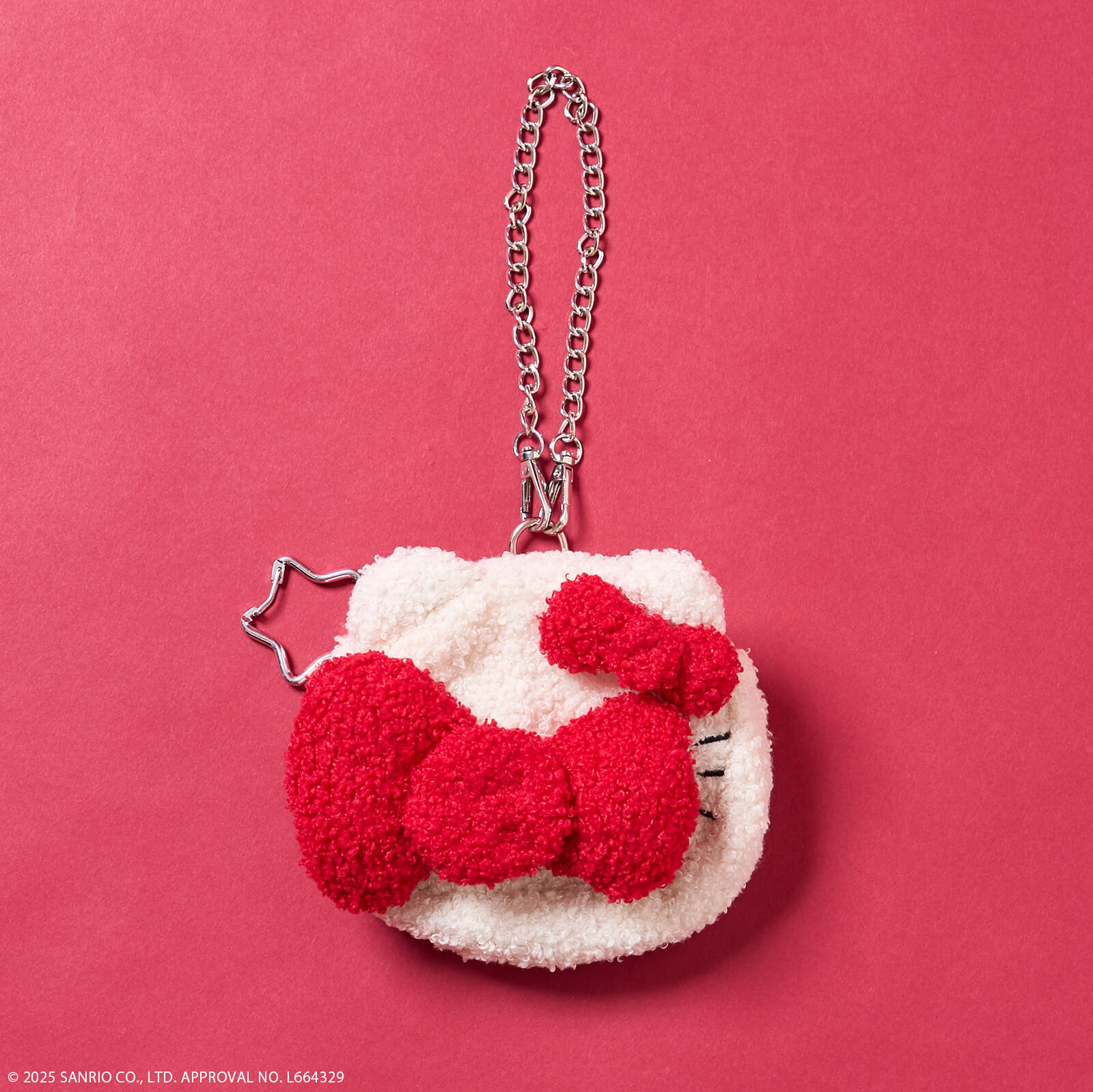ハローキティのお顔をモチーフにした、ぬいぐるみのようなもこもこ素材のチェーンバッグ・チャームポーチ・ポーチの全3アイテムがラインナップ♪