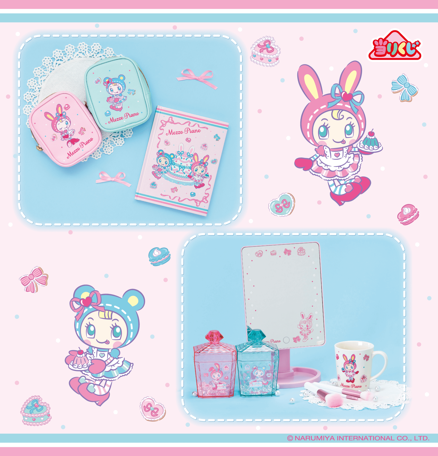 【上段左から:⑤ポーチ ピンク / ⑥ポーチ ブルー / ⑨ノート】