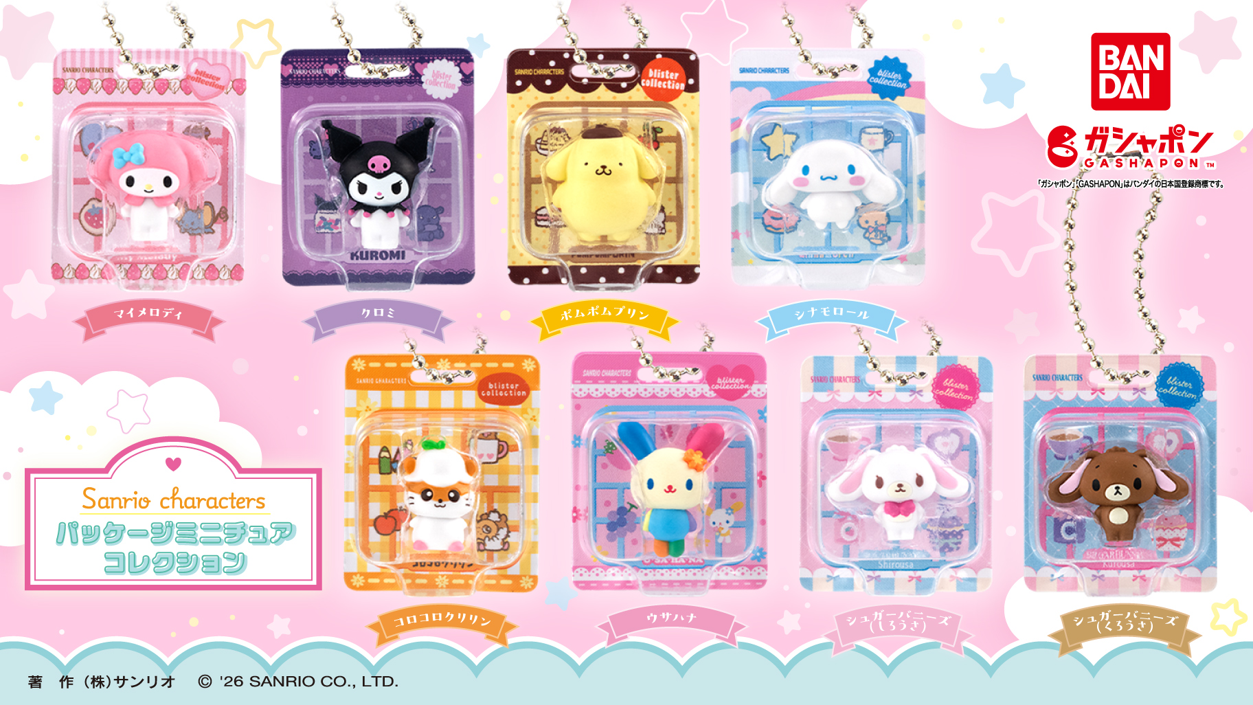 マイメロディ、クロミ、ポムポムプリン、シナモロール、コロコロクリリン、ウサハナ、シュガーバニーズ(しろうさ)、シュガーバニーズ(くろうさ)
