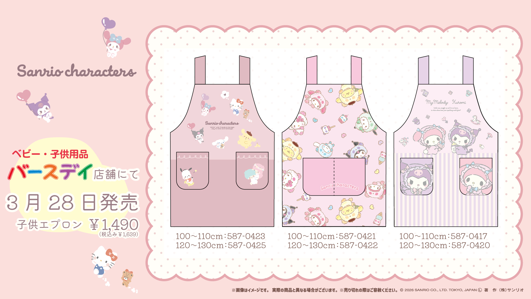 ベビー・子供用品店「バースデイ」にサンリオキャラクターズの「子供エプロン」が登場するよ! ラインナップは全3種。 お気に入りのキャラクターと一緒に、お料理を楽しんじゃおう♪ 全国のバースデイ店舗で3月28日(土)から発売☆ ぜひチェックしてね♡