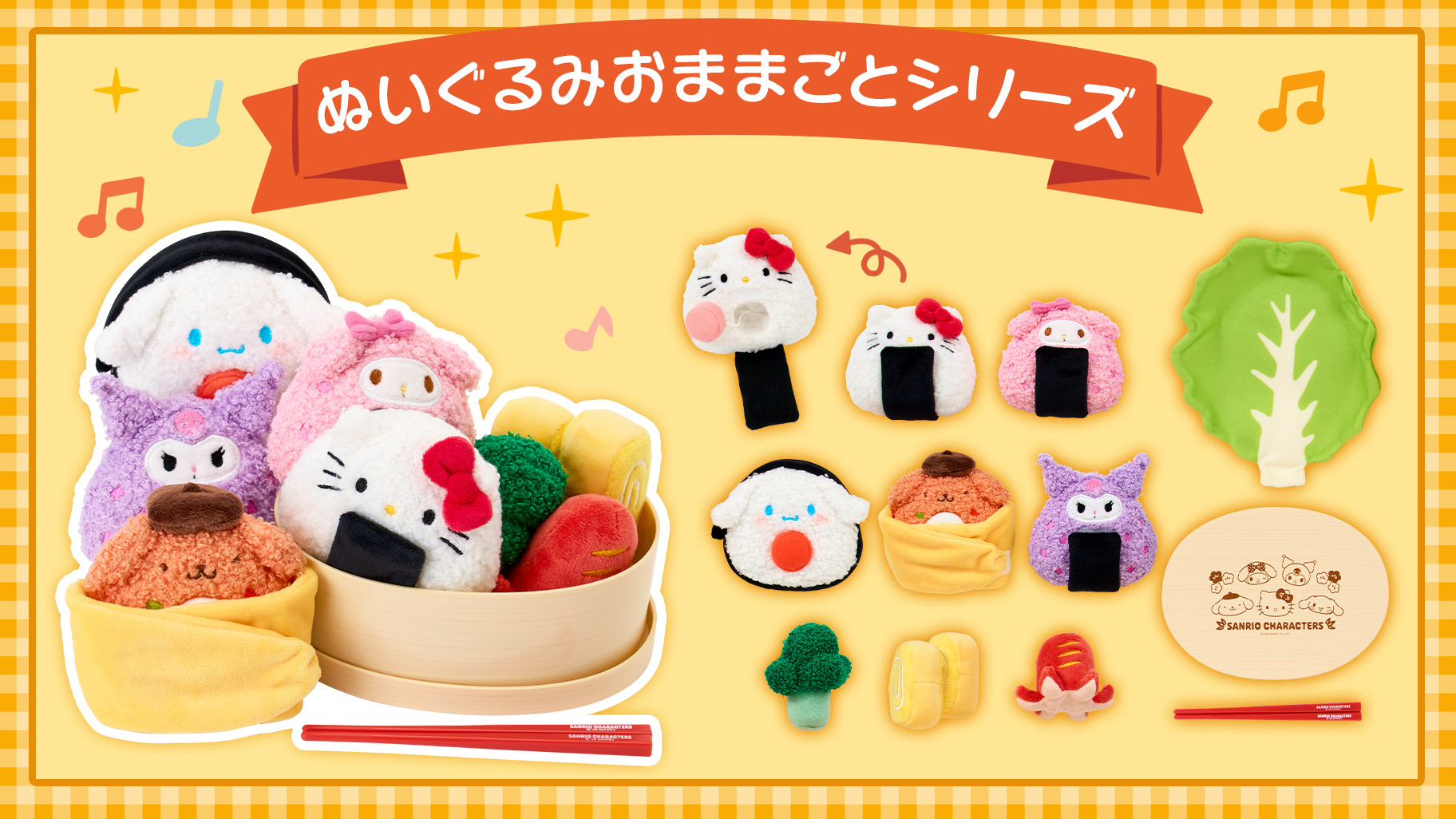 ふわふわの手触りが気持ちいい「おにぎり・おかず」、樹脂製の「お弁当箱・おはし」がセットになったおままごとシリーズ。