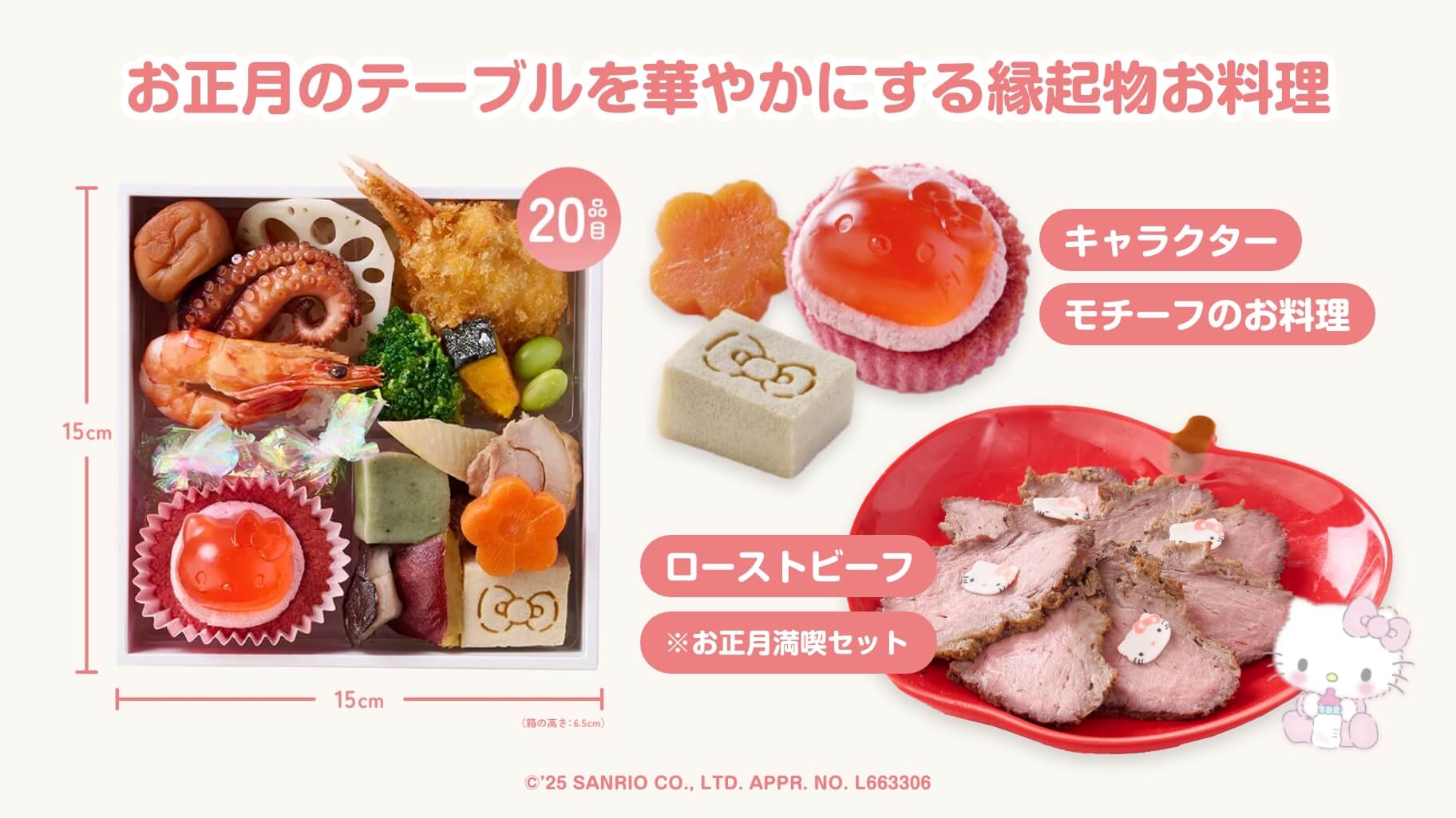 - セット内容 サンリオお重(カニ爪クリーミーフライ、かぼちゃ、枝豆、ブロッコリー、梅花にんじん、よもぎ京生麩、たけのこ煮、しいたけ煮、高野豆腐、鶏の照り焼き、さつまいも揚げ煮、海老塩茹で、たこ煮つけ、酢れんこん、紅白なます、梅干し、ストロベリーカップケーキ、ハローキティグミ、黒豆甘納豆、お麩ショコラ)、ふくわらい×1、ローストビーフ、キャラフル×1、お餅(丸餅700g)、かつおだし×4、祝い箸×3、お召し上がり方×1