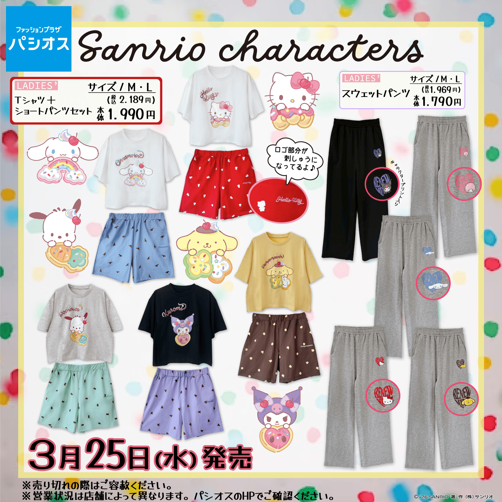全国のパシオス店舗と公式オンラインストア「パシオスNet」に、サンリオキャラクターズのプリントTシャツやパンツ、セットアップが登場するよ♪
