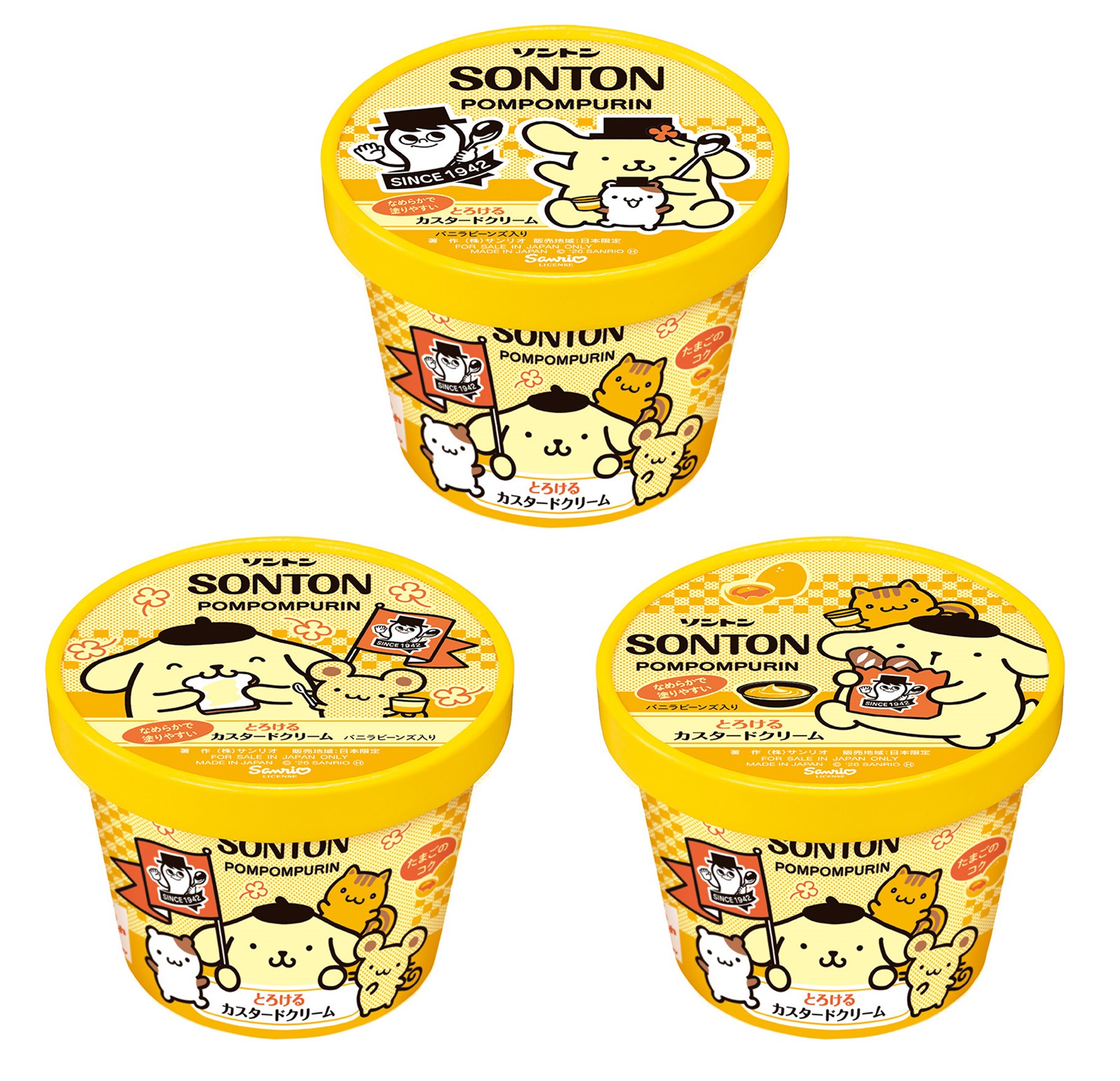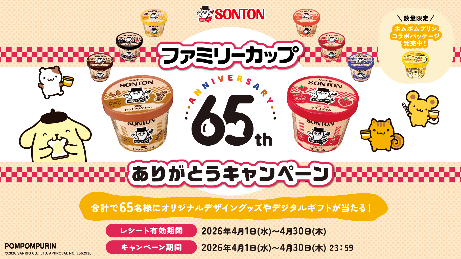 65周年を迎えたソントン食品の紙カップジャム・クリーム「ファミリーカップ」と、30周年を迎えた「ポムポムプリン」がコラボ♪