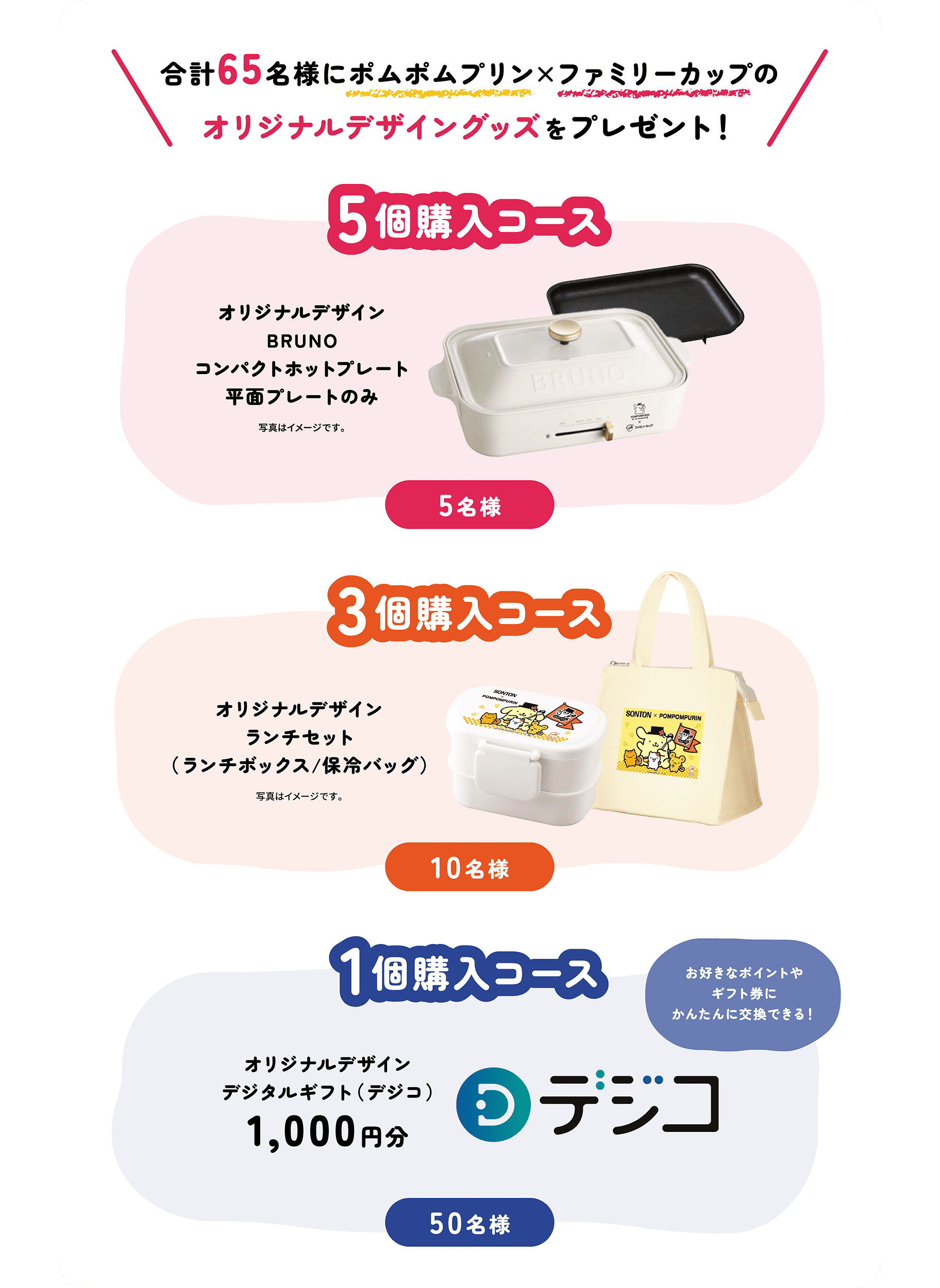 また、抽選で合計65名様に「ポムポムプリン×ファミリーカップ」のオリジナルデザイングッズが当たるキャンペーンも実施中!