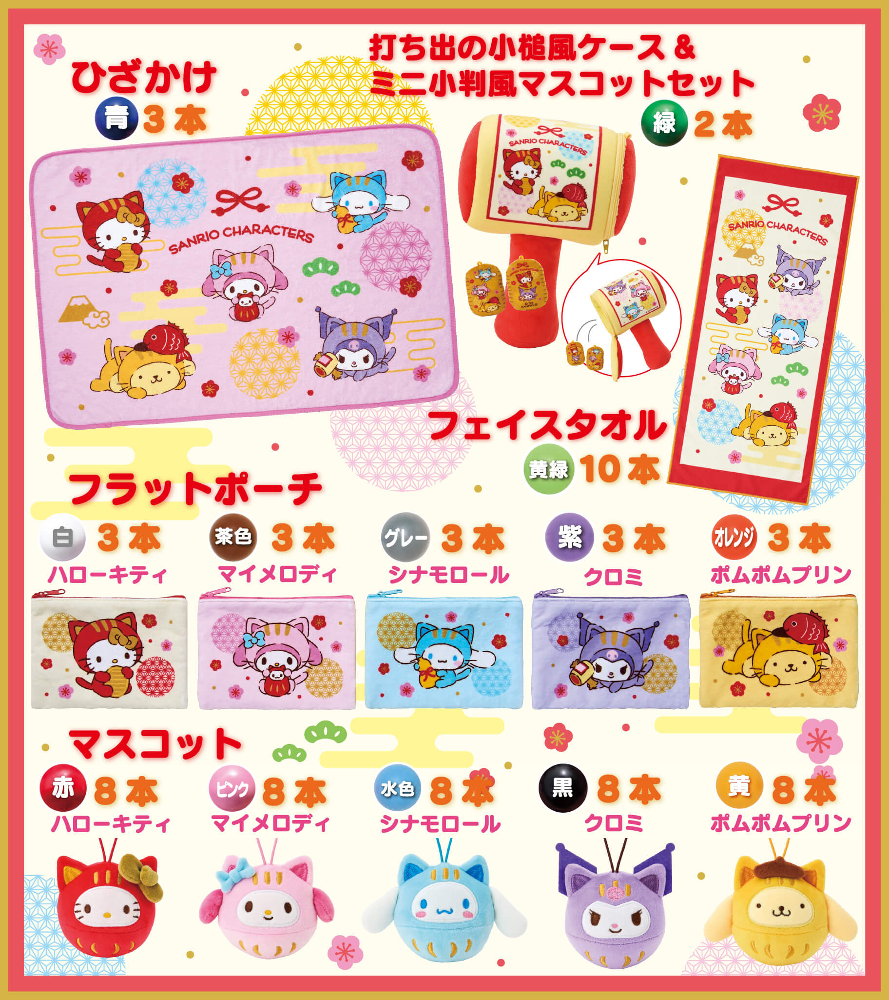 賞品は、ひざかけや打ち出の小槌風ケース&ミニ小判風マスコットセット、フェイスタオルなどがラインナップ。