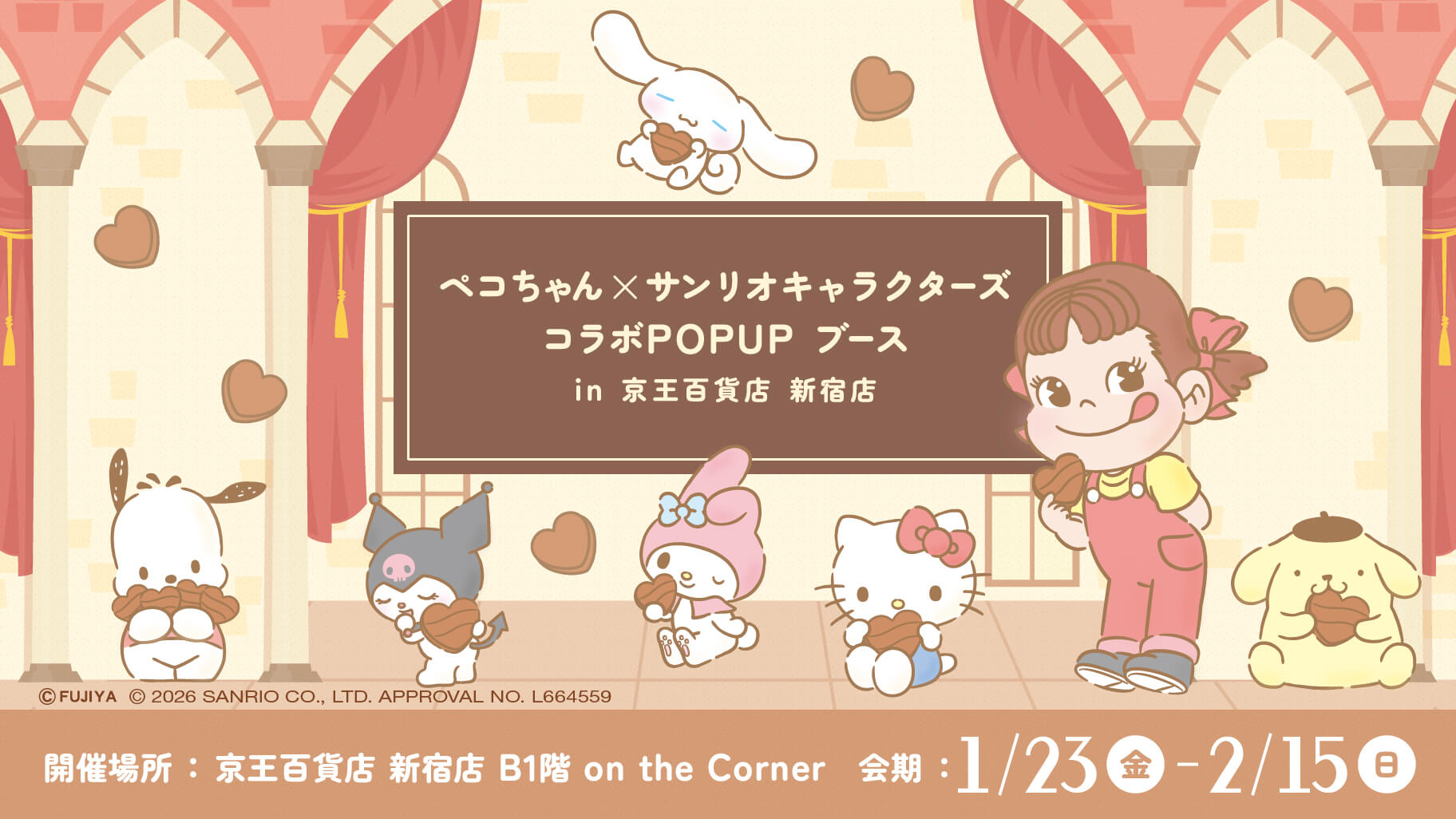ハートのチョコを持ったペコちゃんとサンリオキャラクターズのイラストを使用したパネルがお客様をお出迎え♪