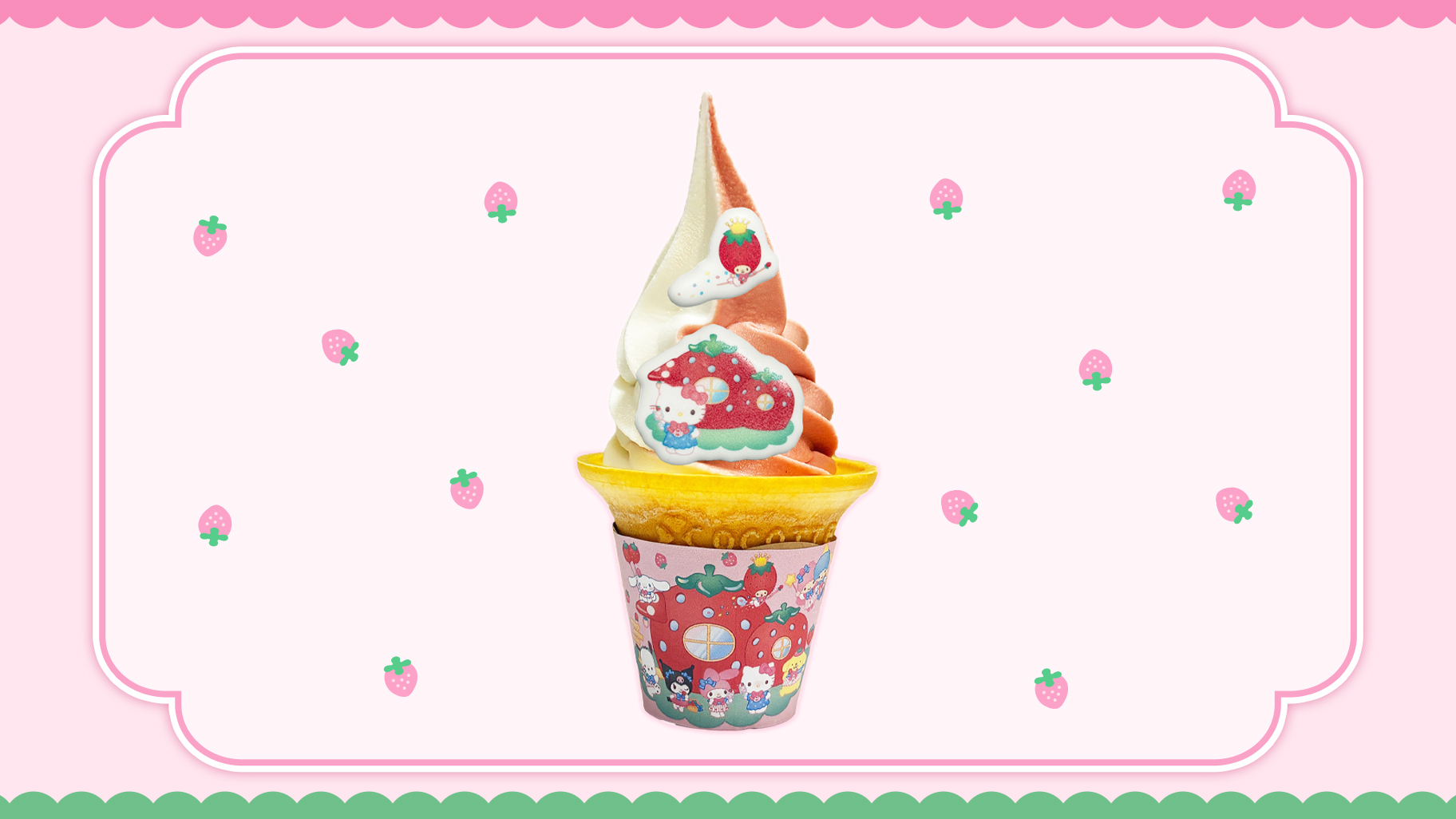 「いちごのお家」オープン期間中、ダイバーシティ東京 プラザ 2Fの「HELLO KITTYのこんがりやき」に、いちごのお家スペシャルバージョンのソフトクリームが登場するよ♪
