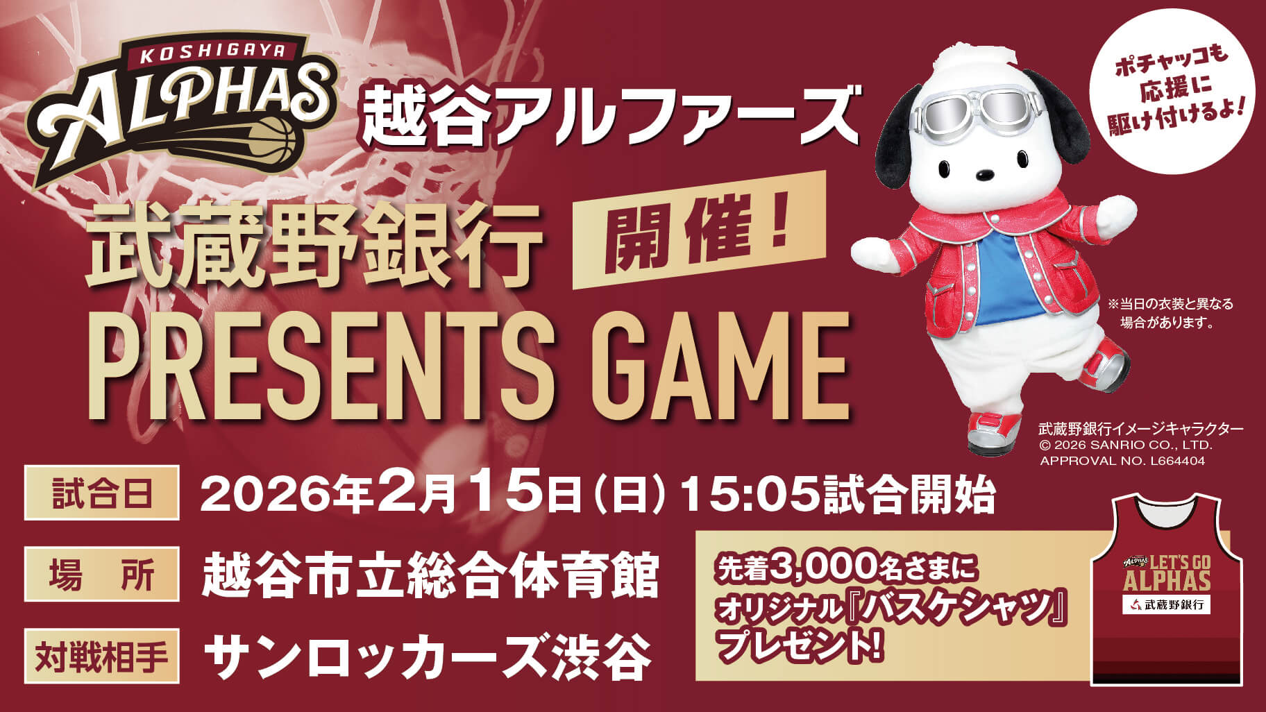 2月15日(日)越谷市立総合体育館(埼玉)で、Bリーグ・越谷アルファーズ「武蔵野銀行プレゼンツゲーム」を開催!