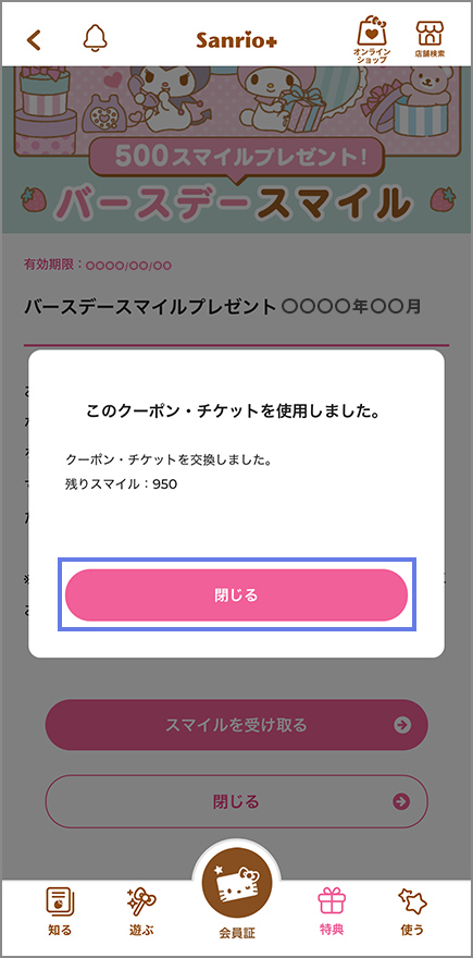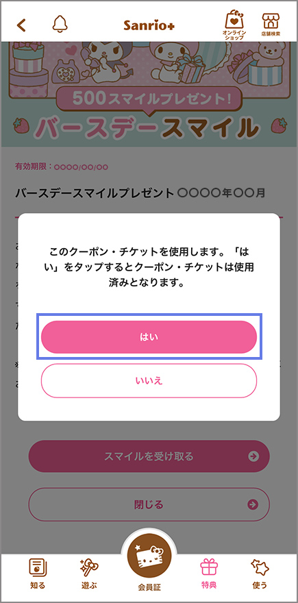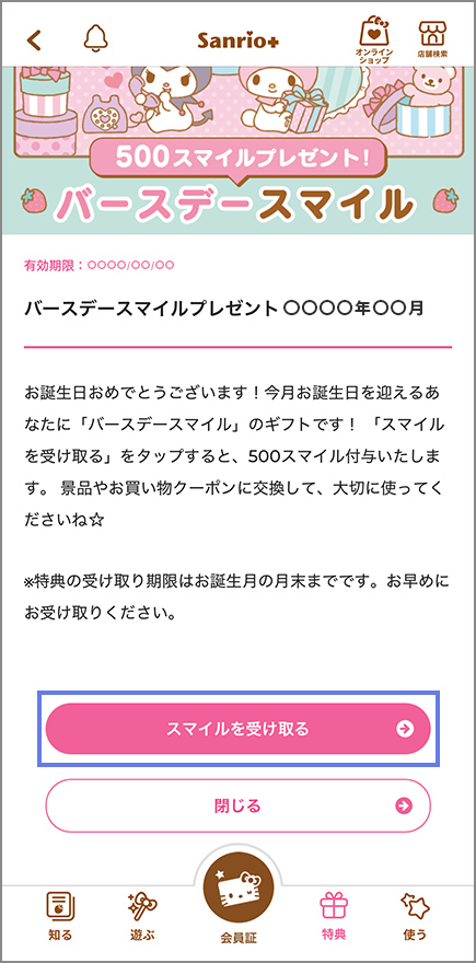 アプリ下部右「特典」>「保持クーポン・チケット」からバースデースマイルを選択し「スマイルを受け取る」をタップしてください。