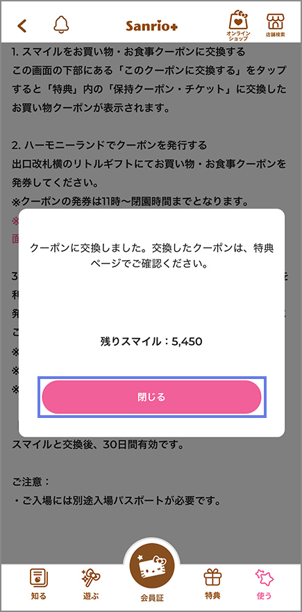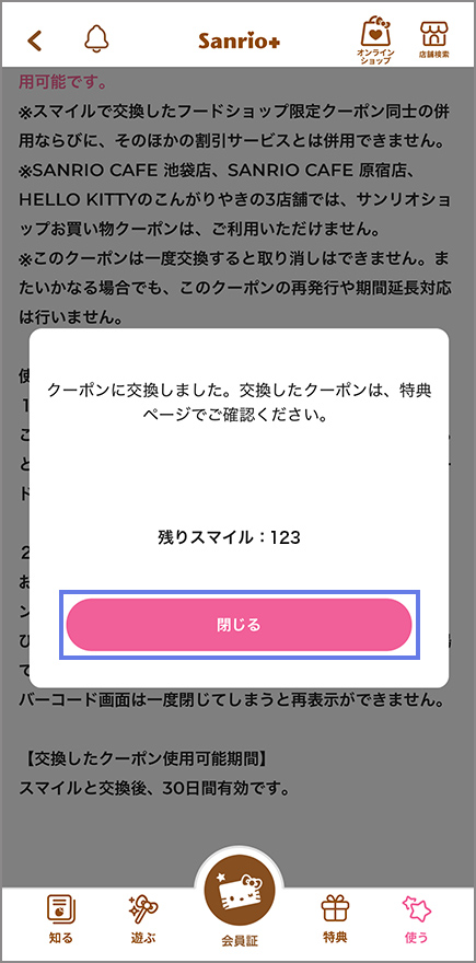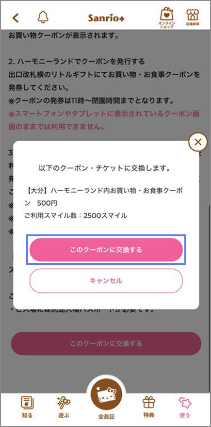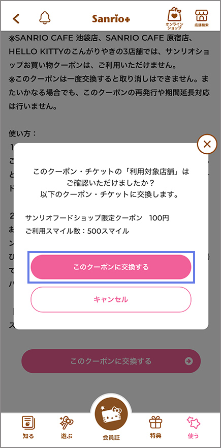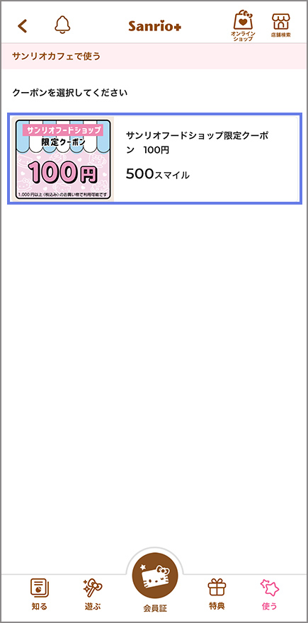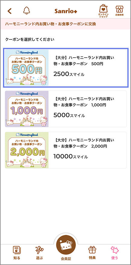 スマイルをサンリオフードショップで利用できるクーポンに交換できます。