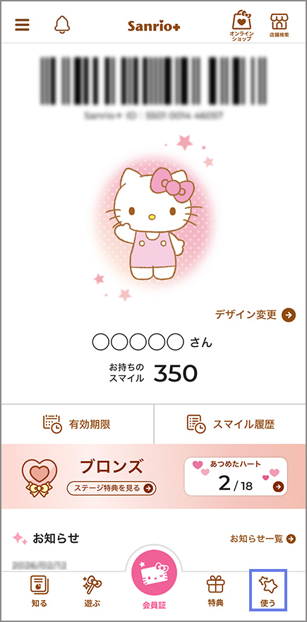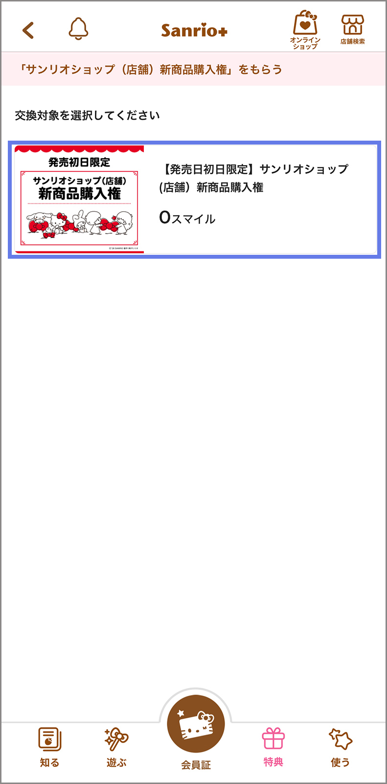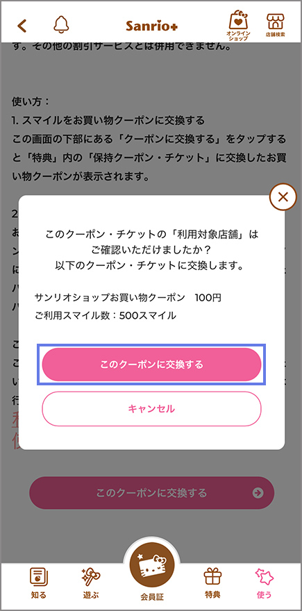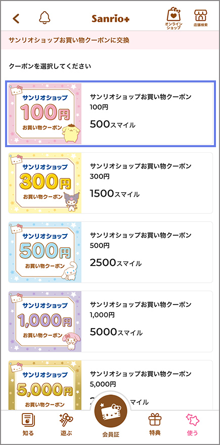 スマイルをサンリオショップで利用できるお買い物クーポンに交換できます。