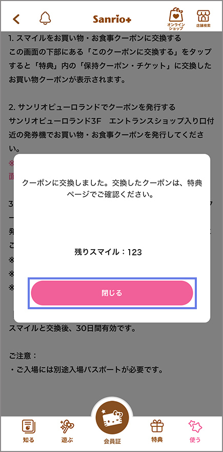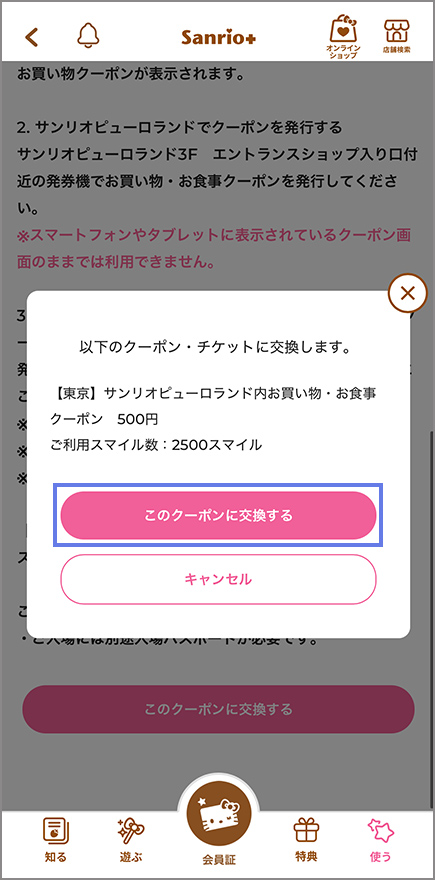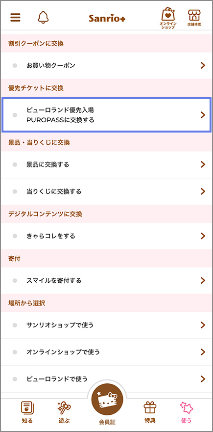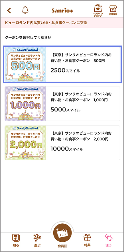 スマイルをサンリオピューロランド内で利用できるお買い物・お食事クーポンに交換できます。