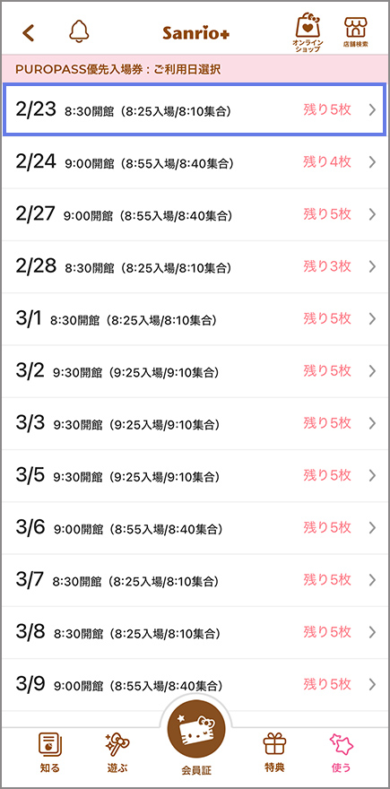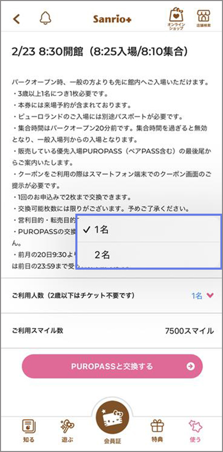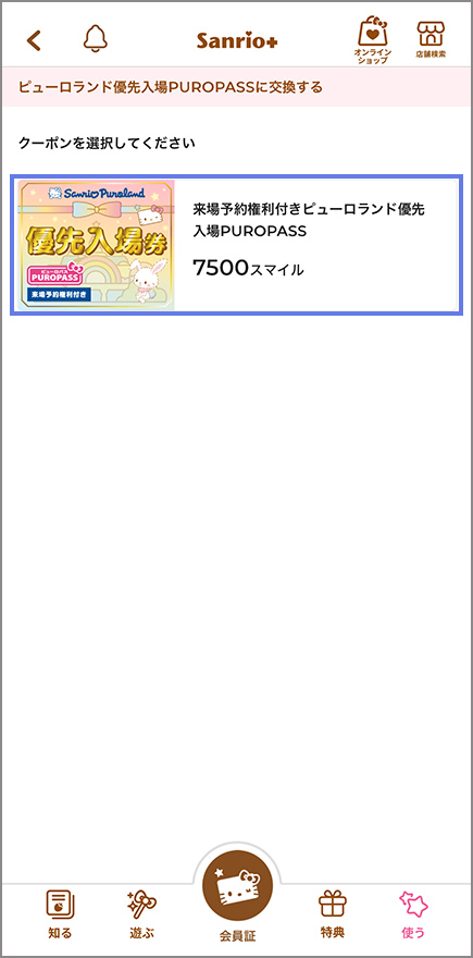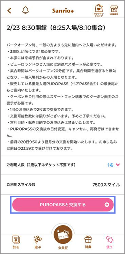 7,500スマイルで来場予約権利付きピューロランド優先入場PUROPASSに交換できます。