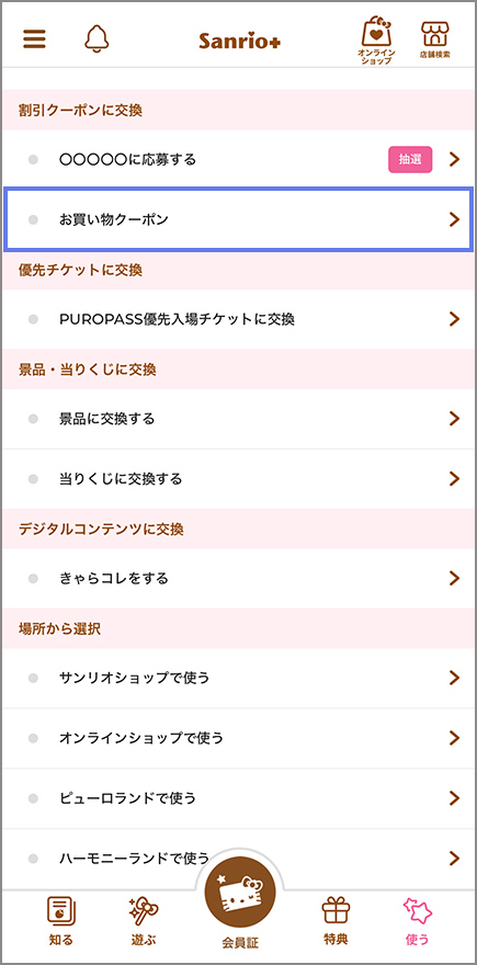 クーポンへの交換はサンリオオンラインショップ本店マイページまたは「ご注文手続き」画面から行えます。