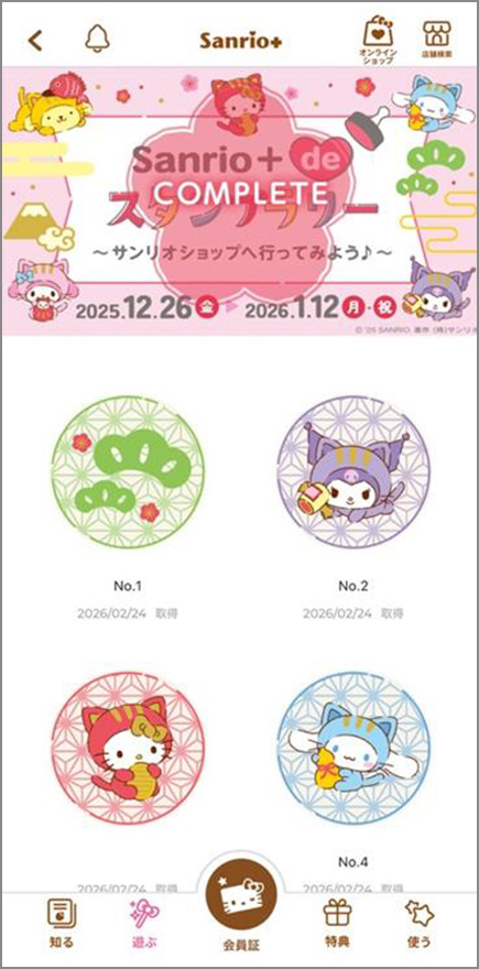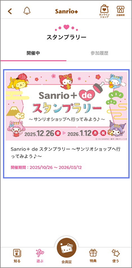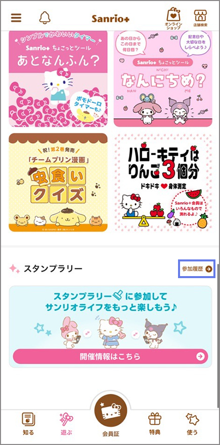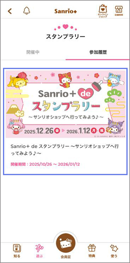 「メニュー」>「会員情報・履歴」>「スタンプラリー参加履歴」からも同じ画面にアクセスできます。