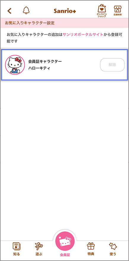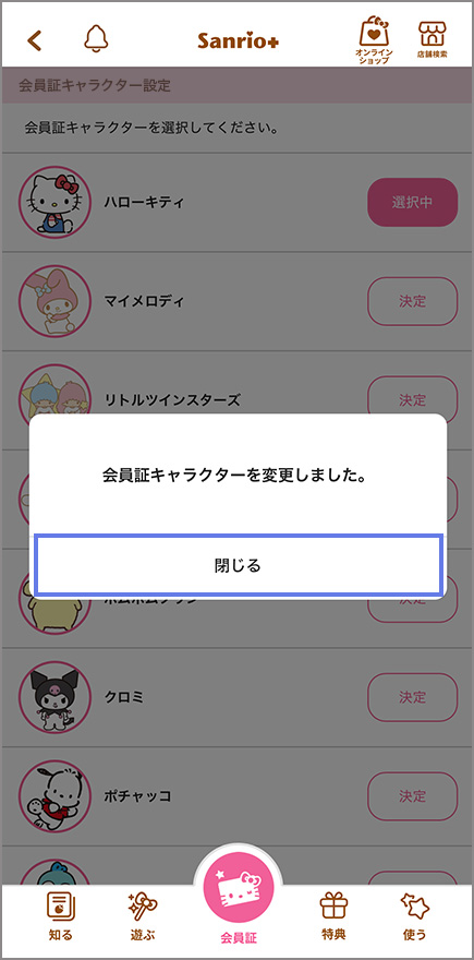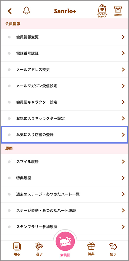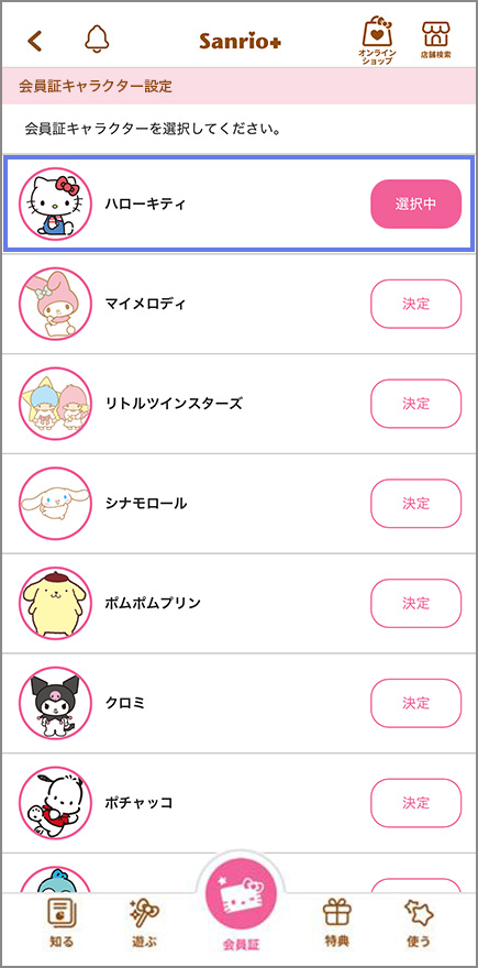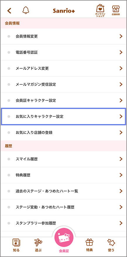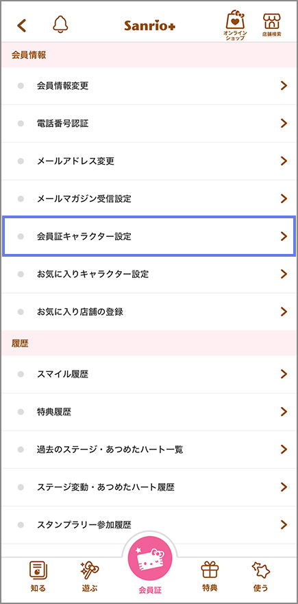 「メニュー」>「会員情報・履歴」>「会員証キャラクター設定」から、会員証キャラクターを設定できます。
