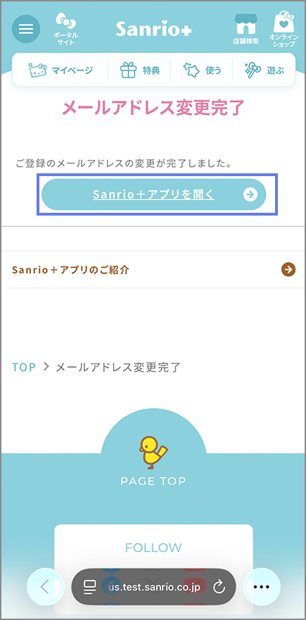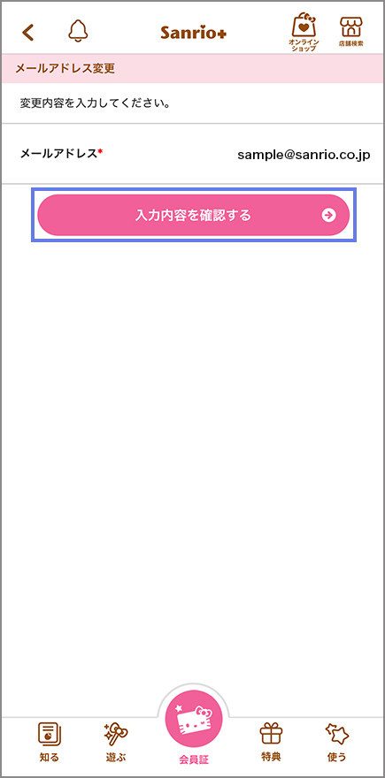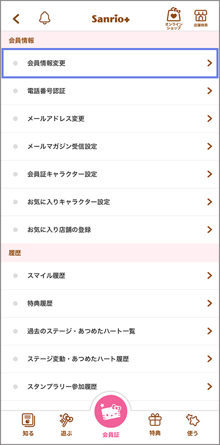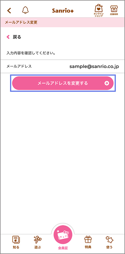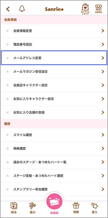 「メニュー」>「会員情報・履歴」>「メールアドレス変更」から、Sanrio+に登録しているメールアドレスを変更できます。