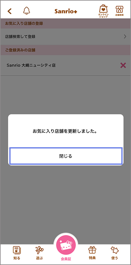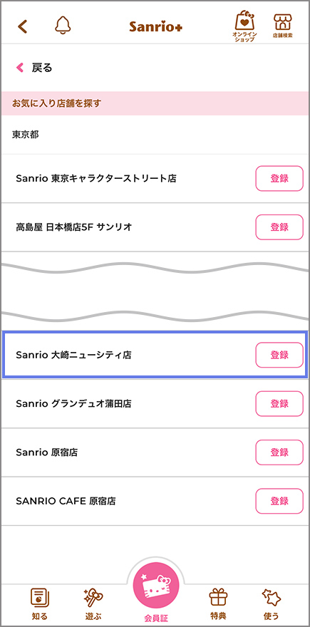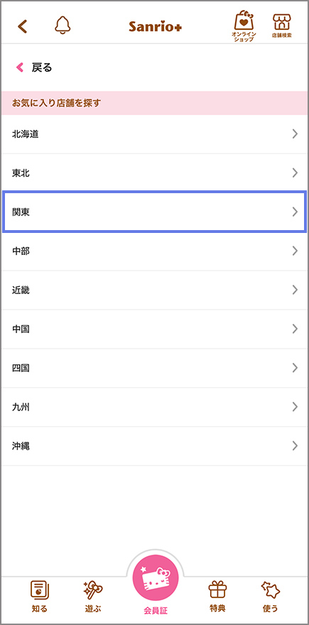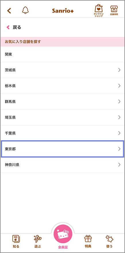 選択した都道府県のSanrio+ポイント付与店舗が一覧で表示されます。