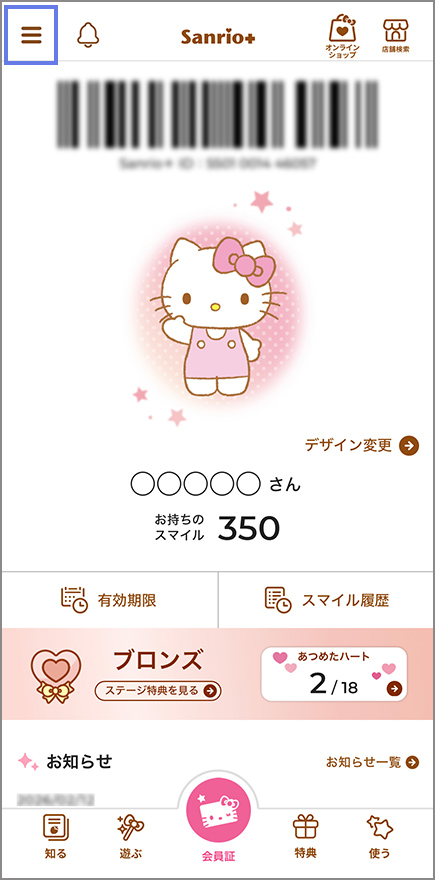 「メニュー」>「Sanrio+仮カードによるスマイル登録」から、仮カードのスマイルをSanrio+アカウントに登録できます。