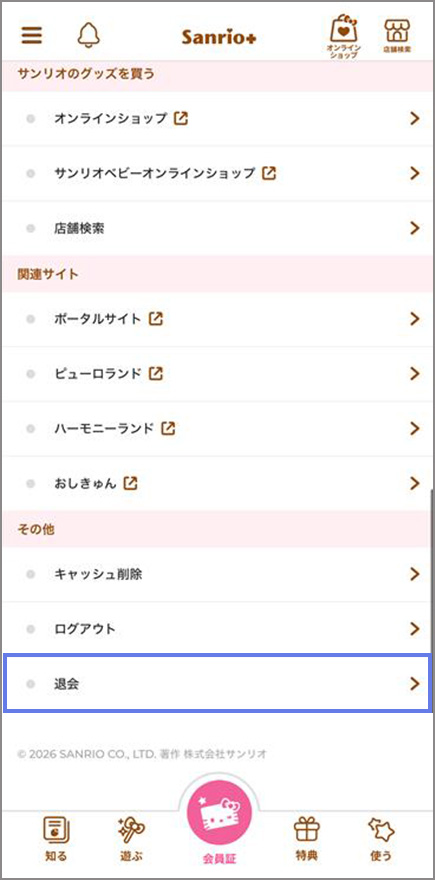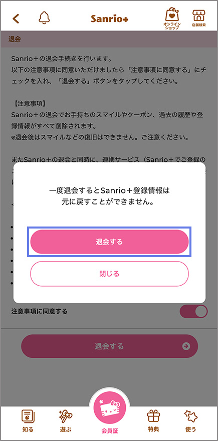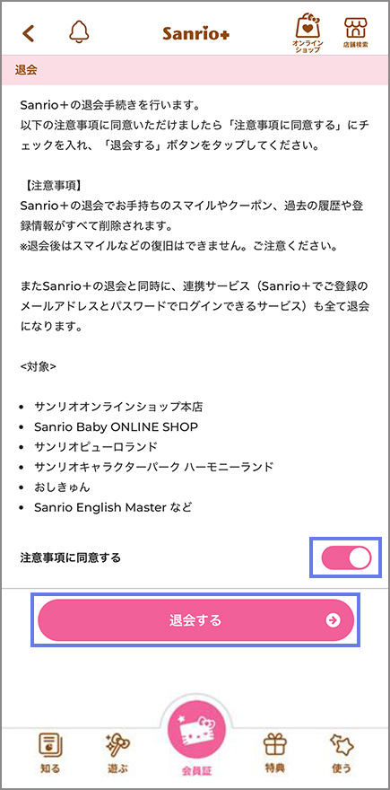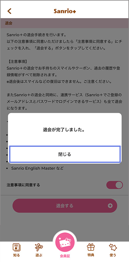 ※サンリオオンラインショップ本店など、Sanrio+アカウントで利用できるすべてのサービスが同時に利用できなくなります。