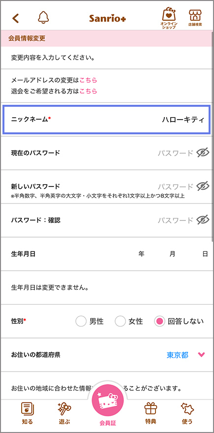 「メニュー」>「会員情報・履歴」>「会員情報変更」から、ニックネーム・パスワード・生年月日・性別・お住まいの都道府県・お子さま情報を変更できます。