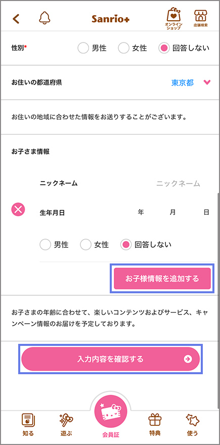 お子さま情報の登録が不要な方は、そのまま「入力内容を確認する」をタップしてください。